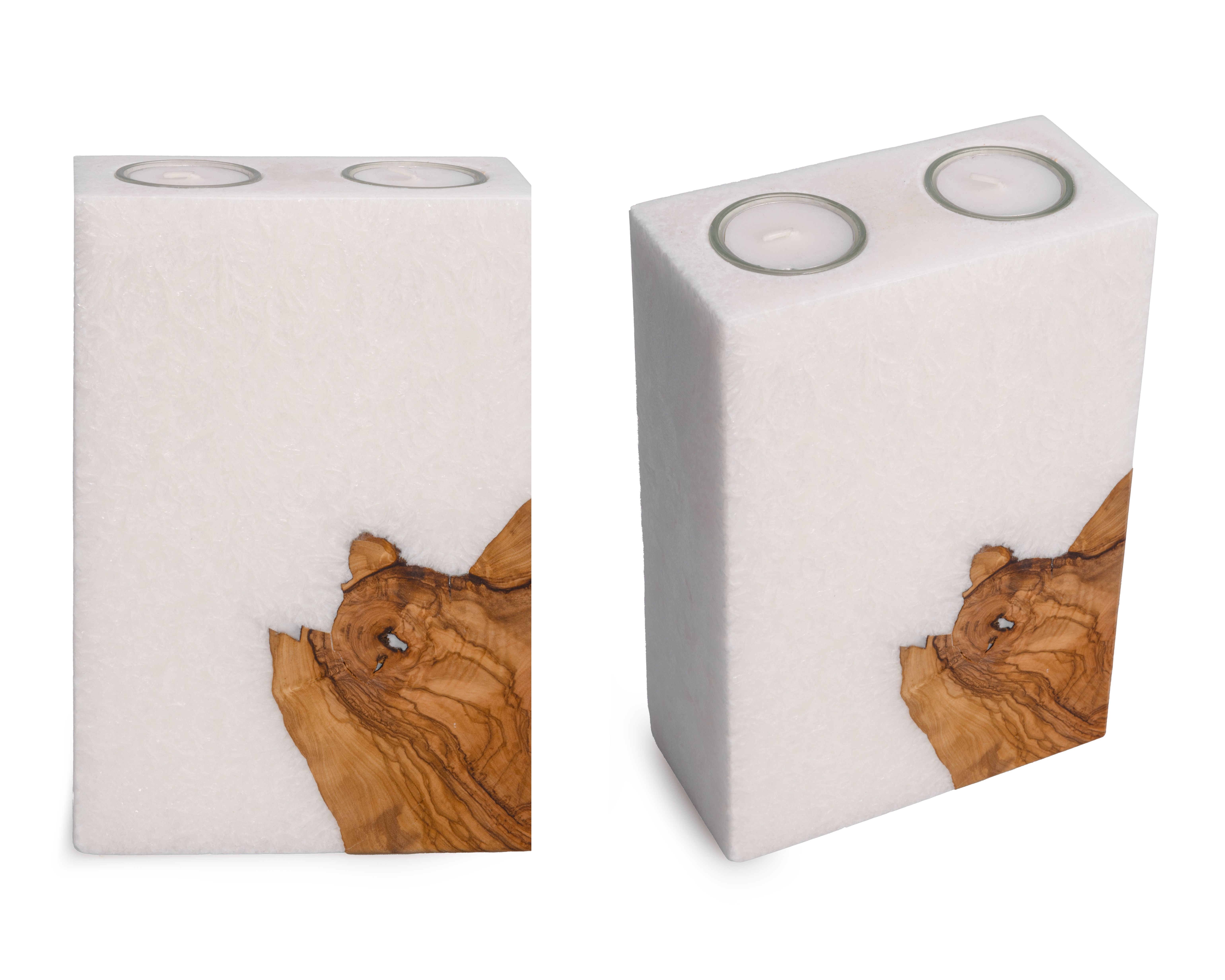 Kerzenrohling Stearin – Crystal Holzkerze Quadrat mit 2 Olivenholzeinsätzen & Teelichteinsatz – 20x20x7 cmDieser hochwertige Kerzenrohling in quadratischer Form vereint moderne Eleganz mit natürlichem Charme. Gefertigt aus 100 % pflanzlichem Stearin, beeindruckt die Kerze durch ihre charakteristische kristalline Oberfläche und die ruhige, saubere Flamme. Zwei echte Olivenholzstücke sind in die Vorderseite eingebettet und machen jede Kerze zu einem stilvollen Unikat.Ob als moderne Hochzeitskerze, liebevoll gestaltetes Erinnerungsstück oder exklusive Geschenkidee – dieser Rohling bietet dir die perfekte Basis für kreative Dekorationen. Dank der integrierten Teelichteinsätze lässt sich die Kerze auch nach dem Abbrennen ganz einfach weiterverwenden.Material: 100 % Stearin, pflanzlichMaße: 20 × 20 × 7 cmOberfläche: kristallin (Crystal Optik)2 eingelassene Olivenholzstücke – jedes Stück ein Naturunikat2 Teelichteinsätze auf der OberseiteIdeal zum Gestalten mit Wachsplatten, Schriftzügen, Symbolen oder TrockenblumenDie Rückseite ist glatt und frei gestaltbar – ideal für Namen, Daten oder persönliche Botschaften.Hinweis: Es handelt sich um einen Rohling ohne Dekor. Dekorationsbeispiele dienen zur Inspiration.Diese Kerze ist auf Wunsch auch mit nur einem Holzeinsatz am unteren Rand erhältlich – einfach im Bestellabschluss im Kommentarfeld angeben.