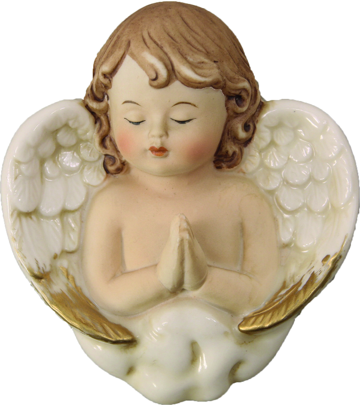 Die stehende Engelsfigur ist weiß und gold patiniert.