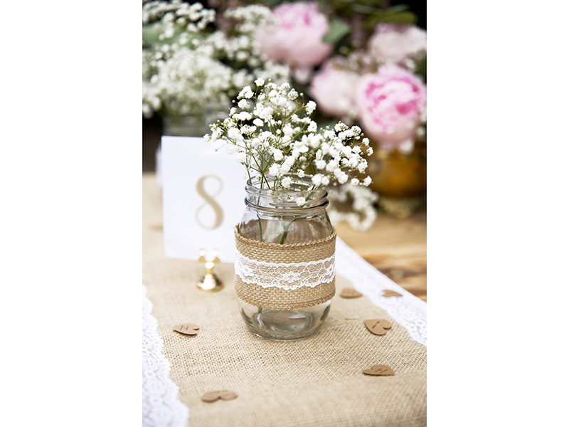 Der Tischläufer aus Jute (100% Jute) ist an den seitlichen Kanten mit einer wunderschönen feinen Blumen-Spitze (100% Polyester) verziert. Die feine Spitze unterstreicht das grobe und rustikale Aussehen der Jute. Die Kanten des Tischläufers sind abgenäht damit die Jute nicht ausfranst.